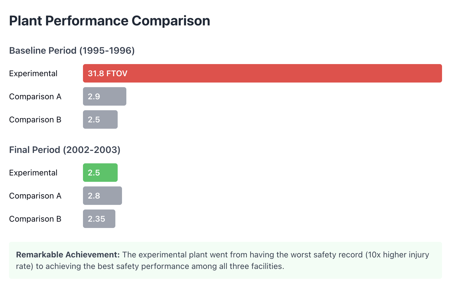 To put this in perspective: the baseline lost-time injury rates at the experimental plant were 980% to 1,150% higher than the comparison plants. By the study's end, the experimental plant's safety performance had not only caught up; it had surpassed both comparison facilities.2