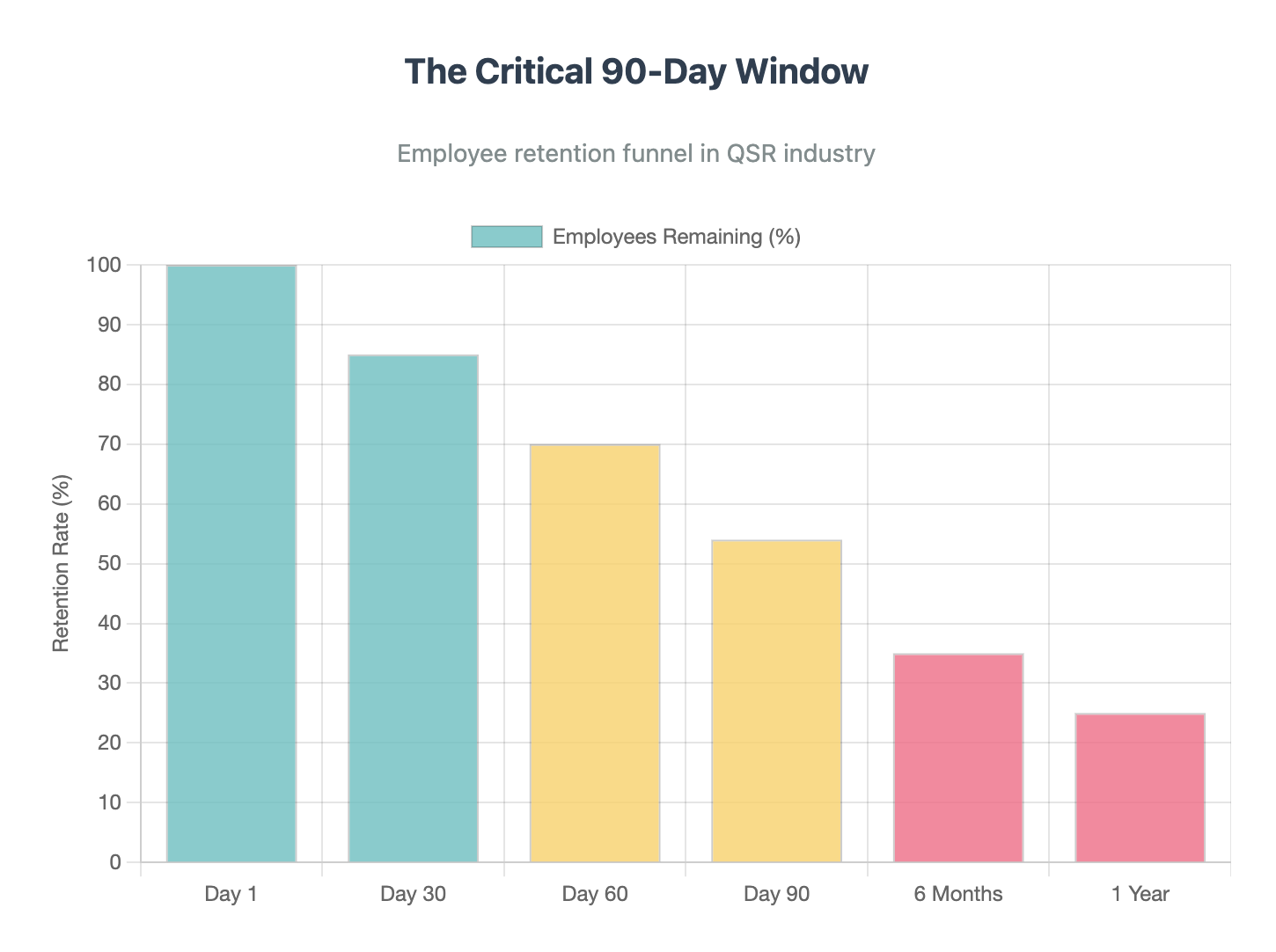 The first 90 days determine everything. Research from the hospitality sector shows that 70% of employers recruited staff within the previous two months throughout 2023, indicating constant churn in those crucial early weeks. When replacement costs average $5,864 per employee in QSRs - 52% of which stems from productivity loss alone - the mathematics of early attrition become devastating at scale.
